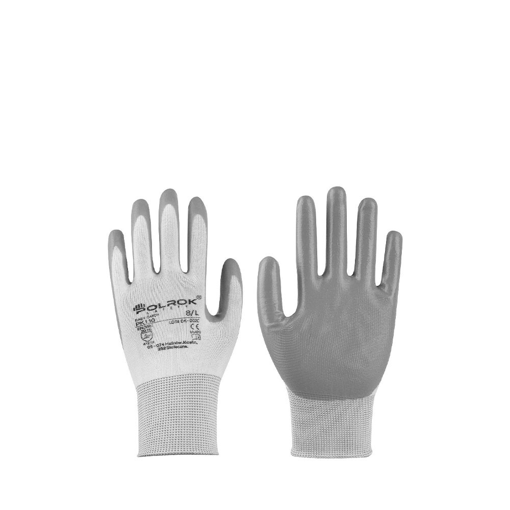 Nejlon - poliészter alapanyagra ujjbegyig mártott védőkesztyű, vékony nitril mártással és gumírozott mandzsettával.