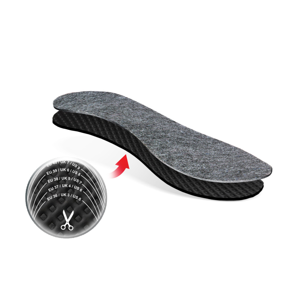 Kényelmes talpbetét kiváló minőségű poliészter kelméből, latex habból, aktív szénnel, mely elnyeli a kellemetlen szagokat. Védi a lábat a hideg ellen, ha alacsony hőmérsékleten dolgozik vagy más tevékenységet végez (kültéren és beltéren egyaránt). A betét alsó felületén alkalmazott mintázott latex hab megakadályozza a talpbetét elcsúszását a lábbeliben. Munkavédelmi és biztonsági lábbelikben való használatra ajánlott. Antisztatikus lábbeliben nem használható.